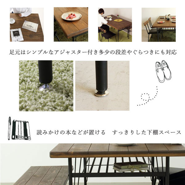 商品説明 サイズ(cm) ◆140ダイニングテーブル W140×D80×H73 ◆ベンチ W100×D36×H44 ◆チェア(2脚) W47×D51×H74 仕様 ◆140ダイニングテーブル・ベンチ 天然木パイン無垢材(オイル塗装) 古木風仕上げ スチール(粉体塗装) ◆チェア 天然木パイン無垢材(オイル塗装) 合成皮革 スチール(粉体塗装) 重量 ◆140ダイニングテーブル:27kg ◆ベンチ:12kg ◆チェア(1脚):7kg 送料 送料無料 ※追加送料が発生する地域がございます。