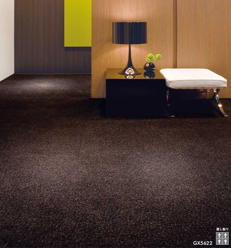 商品名GX-5600 モデルノ Moderno商品データ●パイル:BCFナイロン100%(原着ナイロン)●バッキング:塩ビ樹脂+ガラス繊維布●全厚:9mm (H6mm/L4mm カット&ループパイル)●寸法:500mm×500mm●密度:1/10ゲージ 12.0ステッチ●防炎性能:EO000137●梱包:16枚/ケース(4平米)●重量:23.6g/ケース●工法:流し貼り、市松貼り●制電性:人体帯電圧 1.0kv以下落ち着いた色調のカット&ループパイル。