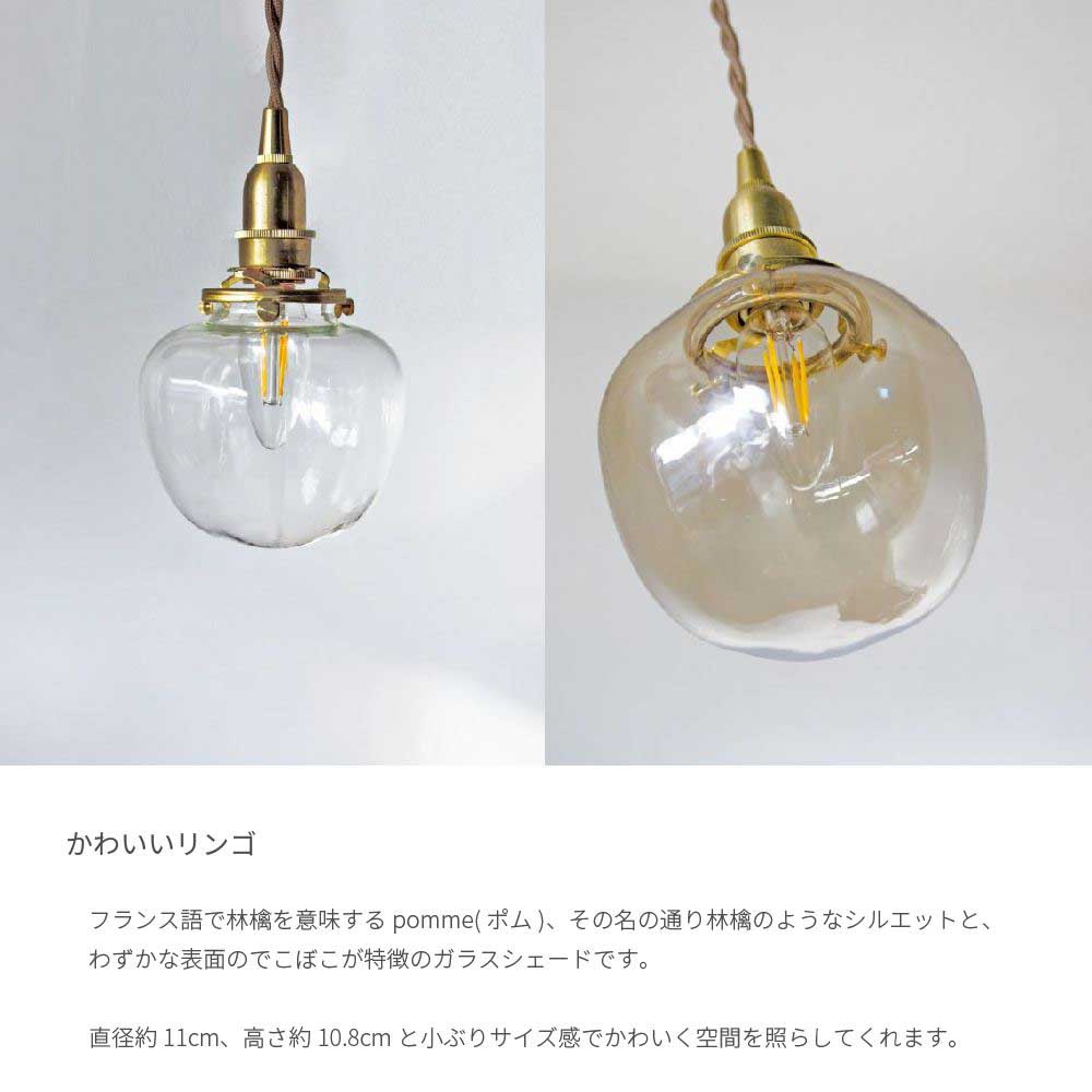 関連キーワードペンダントシェード ポム リンゴ E17 灯具一体型 照明 リビング ダイニング 玄関 寝室 洗面所 トイレ おしゃれ かわいい 北欧 シンプル ナチュラル アンティーク LED 白熱電球 60W 真鍮かわいいリンゴ フランス語で林檎を意味するpomme(ポム)、その名の通り林檎のようなシルエットと、 わずかな表面のでこぼこが特徴のガラスシェードです。
