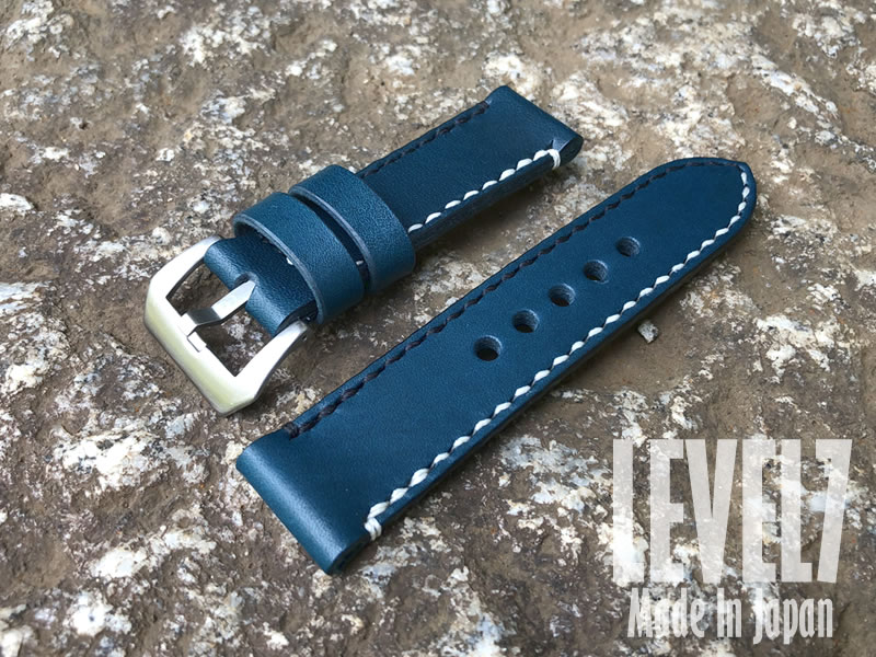 パネライ スタイル オイル染料仕上げ スムース ヌメ革/レザーベルト ブルー ホワイト&ブラックステッチ 総手縫い バックル付き 腕時計 替えベルト SP-H002C6-BLWH LEVEL7【受注生産品】