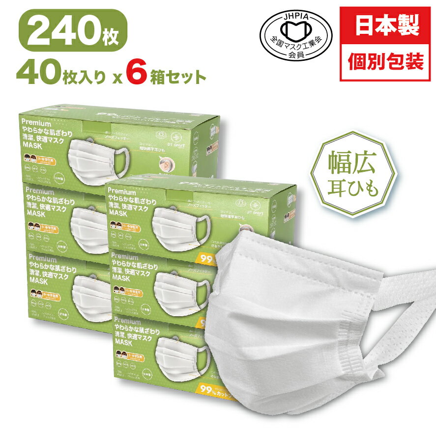 【6箱セット】 マスク プレミアム 240枚入 (40枚×6箱) 不織布マスク 子供 こども 小学生 中学生 こども不織布マスク 小さめ 日本製 子どもマスク 不織布 個包装 子供用マスク sサイズ 個別包装 使い捨て 平ゴム 個包装マスク 子ども不織布マスク 日本製不織布マスク 日本製